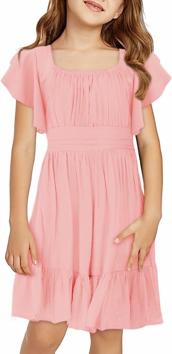 - Features: This girls summer dress comes with a square neck and off-shoulder design, along with a back bow tie to add a touch of elegance. The ruffle hem and A-line cut give it a playful and fun look, while the elastic waist ensures a perfect fit. The classic solid color and above-knee length make it a versatile piece for any occasion.