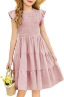 - Features: Solid-color, round neck dress with ruffled sleeves. Elastic pleated chest, side pockets, and knee-length tiered hem create a cute, flowy look.
